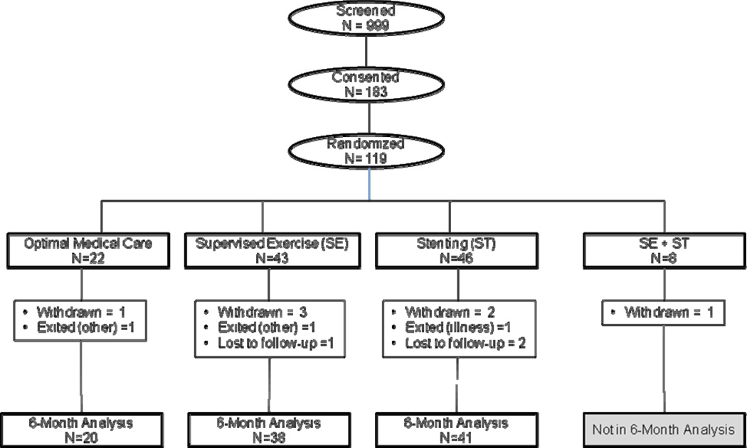 Background: Claudication is a common and disabling symptom of peripheral artery disease that can be treated with medication, supervised exercise (SE), or stent revascularization (ST).