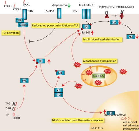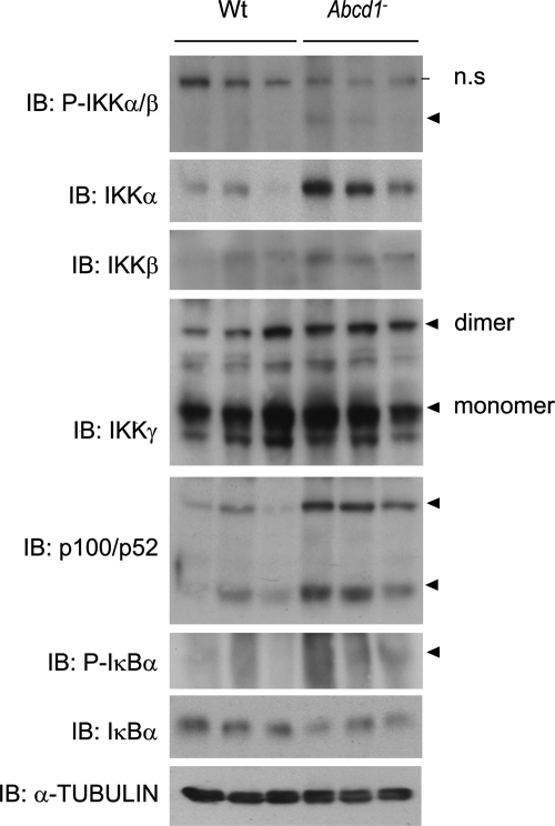 X-linked adrenoleukodystrophy (X-ALD) is an inherited disorder characterized by axonopathy and demyelination in the central nervous system and adrenal insufficiency. Main X-ALD phenotypes are: (i) an adult adrenomyeloneuropathy (AMN) with axonopathy in spinal cords, (ii) cerebral AMN with brain demyelination (cAMN) and (iii) a childhood variant, cALD, characterized by severe cerebral demyelination. Loss of function of the ABCD1 peroxisomal fatty acid transporter and subsequent accumulation of very-long-chain fatty acids (VLCFAs) are the common culprits to all forms of X-ALD, an aberrant microglial activation accounts for the cerebral forms, whereas inflammation allegedly plays no role in AMN. How VLCFA accumulation leads to neurodegeneration and what factors account for the dissimilar clinical outcomes and prognosis of X-ALD variants remain elusive. To gain insights into these questions, we undertook a transcriptomic approach followed by a functional-enrichment analysis in spinal cords of the animal model of AMN, the Abcd1(-) null mice, and in normal-appearing white matter of cAMN and cALD patients. We report that the mouse model shares with cAMN and cALD a common signature comprising dysregulation of oxidative phosphorylation, adipocytokine and insulin signaling pathways, and protein synthesis. Functional validation by quantitative polymerase chain reaction, western blots and assays in spinal cord organotypic cultures confirmed the interplay of these pathways through IkB kinase, being VLCFA in excess a causal, upstream trigger promoting the altered signature. We conclude that X-ALD is, in all its variants, a metabolic/inflammatory syndrome, which may offer new targets in X-ALD therapeutics.