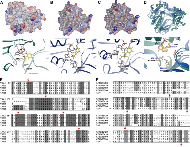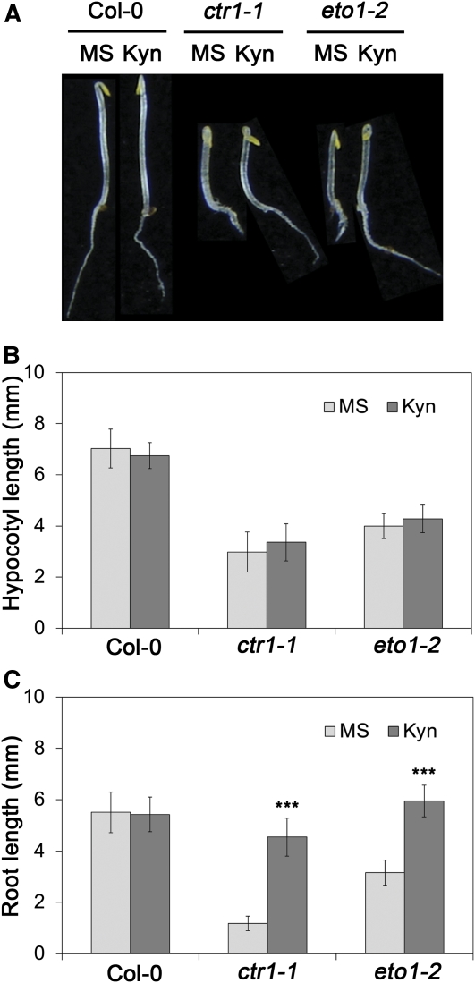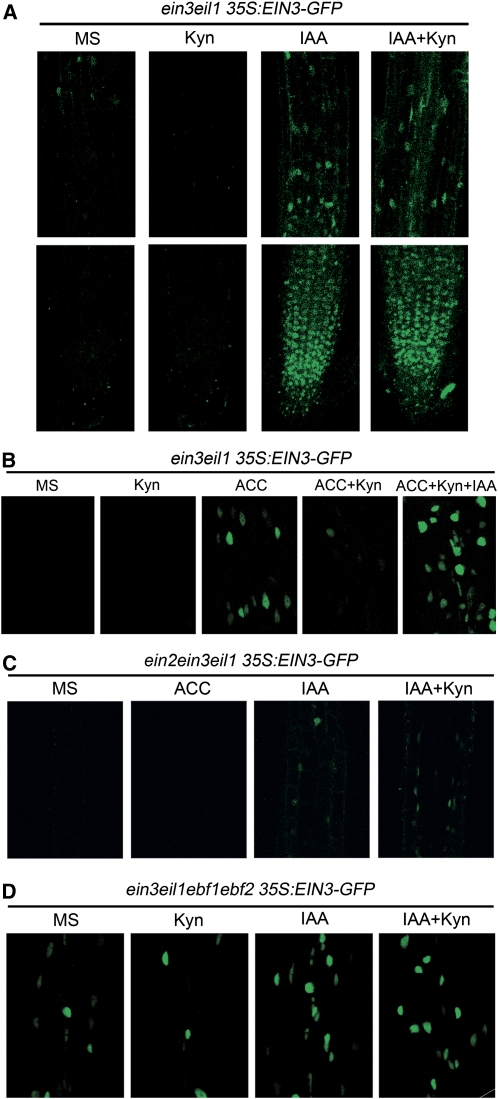The interactions between phytohormones are crucial for plants to adapt to complex environmental changes. One example is the ethylene-regulated local auxin biosynthesis in roots, which partly contributes to ethylene-directed root development and gravitropism. Using a chemical biology approach, we identified a small molecule, l-kynurenine (Kyn), which effectively inhibited ethylene responses in Arabidopsis thaliana root tissues. Kyn application repressed nuclear accumulation of the ETHYLENE INSENSITIVE3 (EIN3) transcription factor. Moreover, Kyn application decreased ethylene-induced auxin biosynthesis in roots, and TRYPTOPHAN AMINOTRANSFERASE OF ARABIDOPSIS1/TRYPTOPHAN AMINOTRANSFERASE RELATEDs (TAA1/TARs), the key enzymes in the indole-3-pyruvic acid pathway of auxin biosynthesis, were identified as the molecular targets of Kyn. Further biochemical and phenotypic analyses revealed that Kyn, being an alternate substrate, competitively inhibits TAA1/TAR activity, and Kyn treatment mimicked the loss of TAA1/TAR functions. Molecular modeling and sequence alignments suggested that Kyn effectively and selectively binds to the substrate pocket of TAA1/TAR proteins but not those of other families of aminotransferases. To elucidate the destabilizing effect of Kyn on EIN3, we further found that auxin enhanced EIN3 nuclear accumulation in an EIN3 BINDING F-BOX PROTEIN1 (EBF1)/EBF2-dependent manner, suggesting the existence of a positive feedback loop between auxin biosynthesis and ethylene signaling. Thus, our study not only reveals a new level of interactions between ethylene and auxin pathways but also offers an efficient method to explore and exploit TAA1/TAR-dependent auxin biosynthesis.