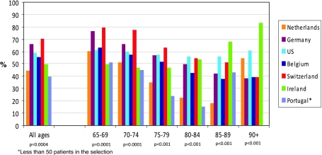Over 40% of breast cancer patients are diagnosed above the age of 65. Treatment of these elderly patients will probably vary over countries. The aim of this study was to make an international comparison (several European countries and the US) of surgical and radiation treatment for elderly women with early stage breast cancer. Survival comparisons were also made. Data were obtained from national or regional population-based registries in the Netherlands, Switzerland, Ireland, Belgium, Germany, and Portugal. For the US patients were selected from the Surveillance, Epidemiology, and End Results (SEER) database. Early stage breast cancer patients aged ≥ 65 diagnosed between 1995 and 2005 were included. An international comparison was made for breast and axillary surgery, radiotherapy after breast conserving surgery (BCS), and relative or cause-specific survival. Overall, 204.885 patients were included. The proportion of patients not receiving any surgery increased with age in many countries; however, differences between countries were large. In most countries more than half of all elderly patients received breast conserving surgery (BCS), with the highest percentage in Switzerland. The proportion of elderly patients that received radiotherapy after BCS decreased with age in all countries. Moreover, in all countries the proportion of patients who do not receive axillary surgery increased with age. No large differences in survival between countries were recorded. International comparisons of surgical treatment for elderly women with early stage breast cancer are scarce. This study showed large international differences in treatment of elderly early stage breast cancer patients, with the most striking result the large proportion of elderly who did not undergo surgery at all. Despite large treatment differences, survival does not seem to be affected in a major way.