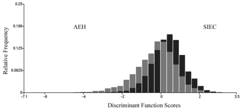 Methods: Cases from GOG study 167A were classified by a central pathology committee as AEH (n=39) or SIEC (n=39). High resolution digitized images of cell nuclei were recorded. Features of the nuclear chromatin pattern were computed. Classification rules were derived by discriminant analysis.