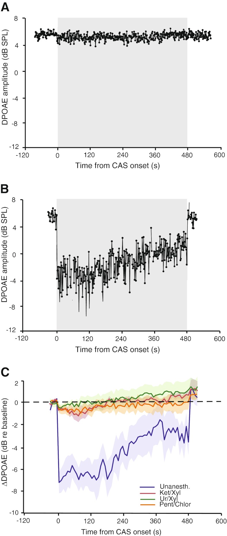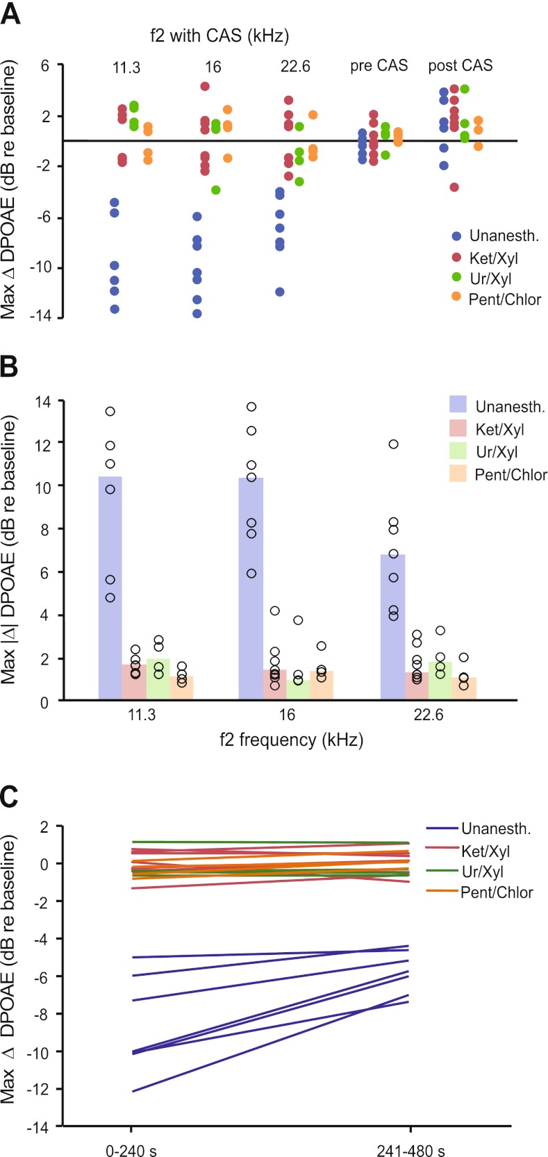 Genetic tools available for the mouse make it a powerful model to study the modulation of cochlear function by descending control systems. Suppression of distortion product otoacoustic emission (DPOAE) amplitude by contralateral acoustic stimulation (CAS) provides a robust tool for noninvasively monitoring the strength of descending modulation, yet investigations in mice have been performed infrequently and only under anesthesia, a condition likely to reduce olivocochlear activation. Here, we characterize the contralateral olivocochlear reflex in the alert, unanesthetized mouse. Head-fixed mice were restrained between two closed acoustic systems, while an artifact rejection protocol minimized contamination from self-generated sounds and movements. In mice anesthetized with pentobarbital, ketamine or urethane, CAS at 80 dB SPL evoked, on average, a <1-dB change in DPOAE amplitude. In contrast, the mean CAS-induced DPOAE suppression in unanesthetized mice was nearly 8 dB. Experiments in mice with targeted deletion of the α9 subunit of the nicotinic acetylcholine receptor confirmed the contribution of the medial olivocochlear efferents to this phenomenon. These findings demonstrate the utility of the CAS assay in the unanesthetized mouse and highlight the adverse effects of anesthesia when probing the functional status of descending control pathways within the auditory system.