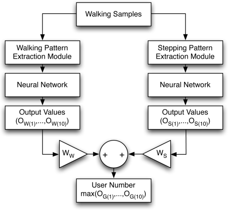 This paper presents a system of identifying individuals by their gait patterns. We take into account various distinguishable features that can be extracted from a user's gait and then divide them into two classes: walking pattern and stepping pattern. The conditions we assume are that our target environments are domestic areas, the number of users is smaller than 10, and all users ambulate with bare feet considering the everyday lifestyle of the Korean home. Under these conditions, we have developed a system that identifies individuals' gait patterns using our biometric sensor, UbiFloorII. We have created UbiFloorII to collect walking samples and created software modules to extract the user's gait pattern. To identify the users based on the gait patterns extracted from walking samples over UbiFloorII, we have deployed multilayer perceptron network, a feedforward artificial neural network model. The results show that both walking pattern and stepping pattern extracted from users' gait over the UbiFloorII are distinguishable enough to identify the users and that fusing two classifiers at the matching score level improves the recognition accuracy. Therefore, our proposed system may provide unobtrusive and automatic user identification methods in ubiquitous computing environments, particularly in domestic areas.