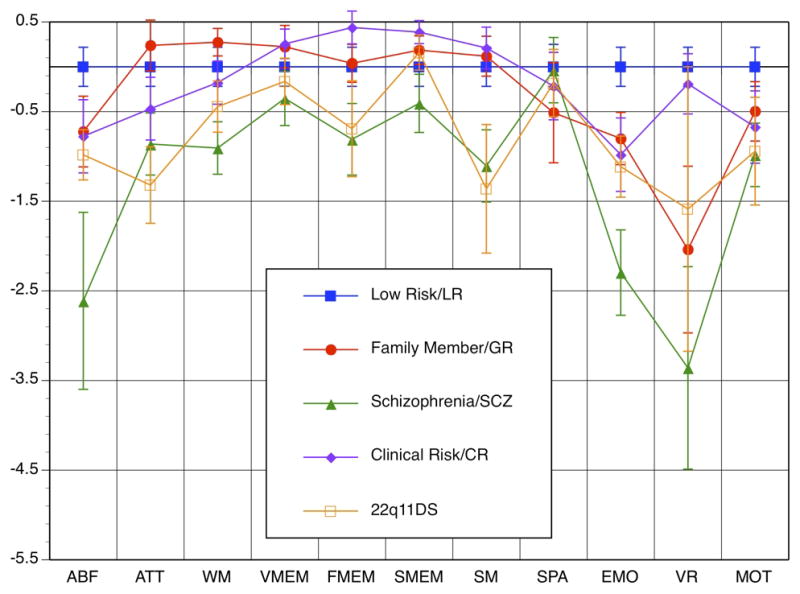 Adults with 22q11.2 Deletion syndrome (22q11DS) have increased prevalence of schizophrenia features. Our goal is to compare the neurocognitive profile in 22q11DS, schizophrenia and individuals at risk for schizophrenia. Twenty-one 22q11DS patients (8-32 years, mean 14.9 years, 15M, 6F) were matched to four comparison groups on age: low risk (n = 21), first-degree family members of schizophrenia patients (genetic risk, n = 20), individuals exhibiting putatively prodromal symptoms (clinical risk, n = 19), and patients with schizophrenia (n = 21). All participants received semi-structured interviews [Diagnostic Interview for Genetic Studies (DIGS) and the Structured Interview for Prodromal Syndromes (SIPS)], and a computerized neurocognitive battery (CNB) measuring the following domains: Abstraction and Mental Flexibility, Attention, Working Memory, Verbal Memory, Face Memory, Spatial Memory, Language, Spatial Processing, Sensorimotor Dexterity, and Emotion Processing. Sixty percent of 22q11DS participants met SIPS criteria for prodromal symptoms and one participant met criteria for paranoid schizophrenia. Thirty-eight percent met criteria for Depressive Disorders. All 22q11DS participants successfully completed the CNB. 22q11DS participants were significantly less accurate in nearly all domains, but had similar speed of response compared to the other groups. Their profile resembled that of the psychosis groups in accuracy and speed, except for more pronounced deficits in accuracy for face memory and emotion processing. Subthreshold psychotic symptoms are present in a high proportion of 22q11DS participants. Deficits shown in the CNB are more pronounced for accuracy than speed relative to the psychosis groups with similar profiles. Similar deficits have been described in the 22q11DS population using non-computerized measures, which require increased testing time.