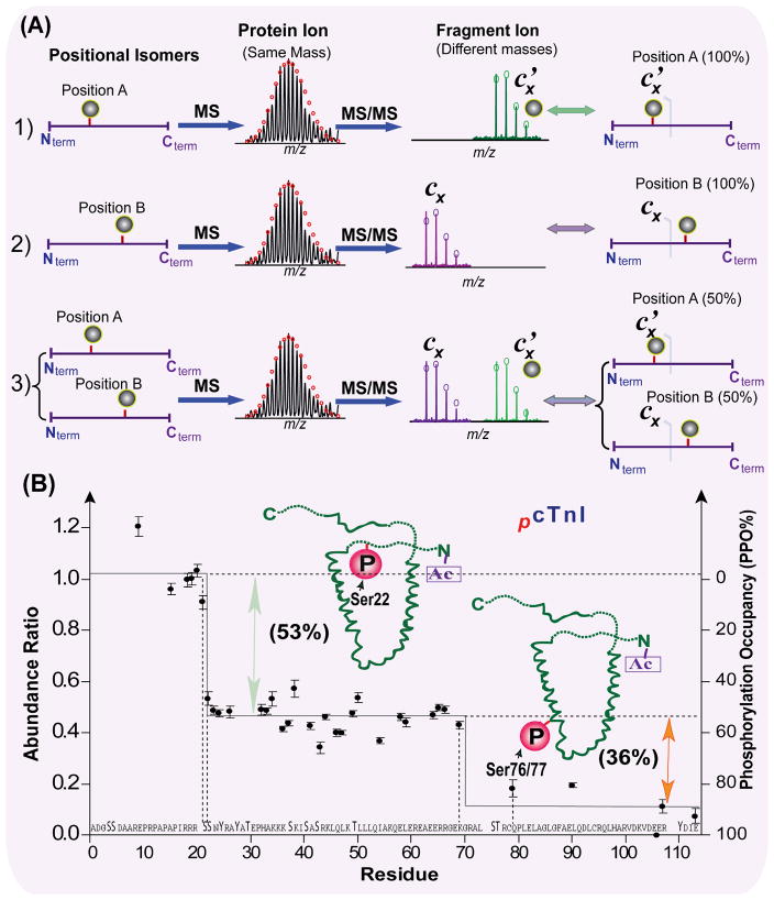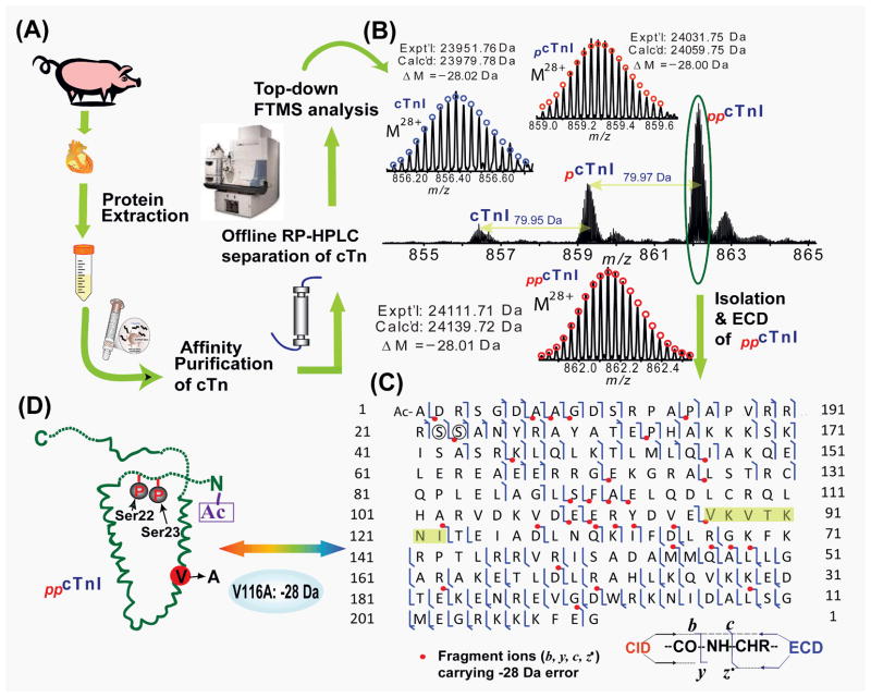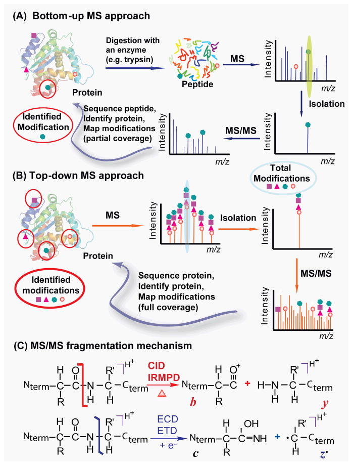 Mass spectrometry (MS)-based proteomics is playing an increasingly important role in cardiovascular research. Proteomics includes identification and quantification of proteins and the characterization of protein modifications, such as posttranslational modifications and sequence variants. The conventional bottom-up approach, involving proteolytic digestion of proteins into small peptides before MS analysis, is routinely used for protein identification and quantification with high throughput and automation. Nevertheless, it has limitations in the analysis of protein modifications, mainly because of the partial sequence coverage and loss of connections among modifications on disparate portions of a protein. An alternative approach, top-down MS, has emerged as a powerful tool for the analysis of protein modifications. The top-down approach analyzes whole proteins directly, providing a "bird's-eye" view of all existing modifications. Subsequently, each modified protein form can be isolated and fragmented in the mass spectrometer to locate the modification site. The incorporation of the nonergodic dissociation methods, such as electron-capture dissociation (ECD), greatly enhances the top-down capabilities. ECD is especially useful for mapping labile posttranslational modifications that are well preserved during the ECD fragmentation process. Top-down MS with ECD has been successfully applied to cardiovascular research, with the unique advantages in unraveling the molecular complexity, quantifying modified protein forms, complete mapping of modifications with full-sequence coverage, discovering unexpected modifications, identifying and quantifying positional isomers, and determining the order of multiple modifications. Nevertheless, top-down MS still needs to overcome some technical challenges to realize its full potential. Herein, we reviewed the advantages and challenges of the top-down method, with a focus on its application in cardiovascular research.