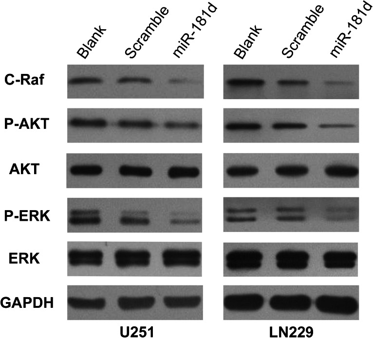 Results: MiR-181d was down-regulated in human glioma samples and up-regulated in transfected glioma cells. Ectopic expression of miR-181d suppressed proliferation and triggered cell cycle arrest and apoptosis in glioma cell lines. K-ras and Bcl-2 were identified as direct targets of miR-181d and were up-regulated in glioma samples. The results showed evidence linking the tumor suppressor activity of miR-181d in glioma cells with the K-ras-related PI3K/AKT and MAPK/ERK pathways. Furthermore, xenograft tumors from miR-181d-treated U251 cells were suppressed in vivo.