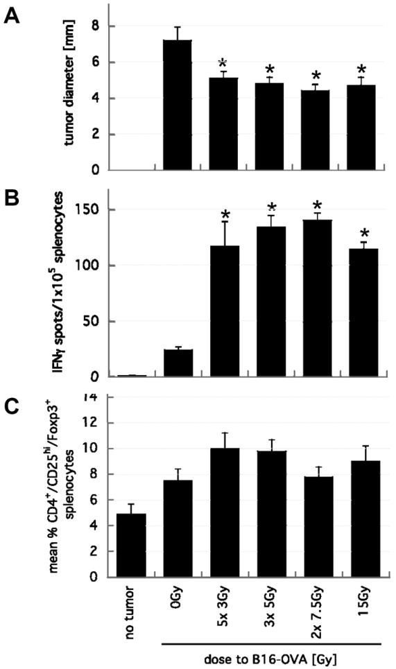Methods and materials: Mice bearing B16-OVA murine melanoma were treated with up to 15 Gy radiation given in various-size fractions, and tumor growth followed. The tumor-specific immune response in the spleen was assessed by interferon-γ enzyme-linked immunospot (ELISPOT) assay with ovalbumin (OVA) as the surrogate tumor antigen and the contribution of regulatory T cells (Tregs) determined by the proportion of CD4(+)CD25(hi)Foxp3(+) T cells.