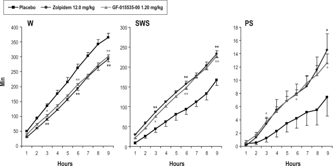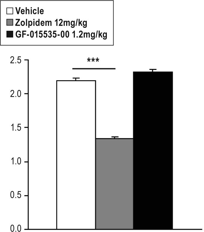 Methods: Nine C57Bl6/J male mice were chronically implanted with electrodes for EEG and sleep-wake monitoring. Each mouse received 3 doses of GF-015535-00 and zolpidem. Time spent in sleep-wake states and cortical EEG power spectra were analyzed.