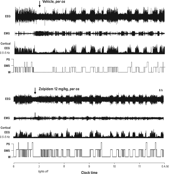 Results: Both zolpidem and GF-015535-00 prominently enhanced slow wave sleep and paradoxical sleep in the mouse. However, as compared with zolpidem, GF-015535-00 showed several important differences: (1) a comparable sleep-enhancing effect was obtained with a 10 fold smaller dose; (2) the induced sleep was less fragmented; (3) the risk of subsequent wake rebound was less prominent; and (4) the cortical EEG power ratio between slow wave sleep and wake was similar to that of natural sleep and thus compatible with physiological sleep.