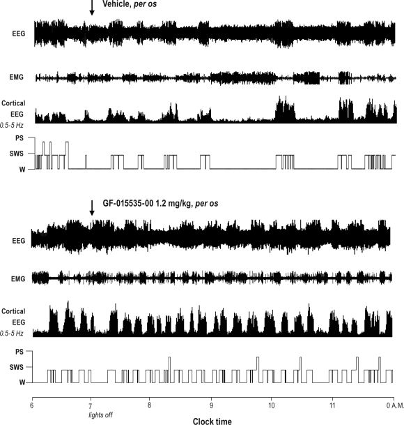 Conclusion: The characteristics of the sleep-wake effects of GF-015535-00 in mice could be potentially beneficial for its use as a therapeutic compound in the treatment of insomnia. Further investigations are required to assess whether the same characteristics are conserved in other animal models and humans.