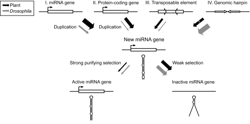 - Allen E, et al. Evolution of microRNA genes by inverted duplication of target gene sequences in Arabidopsis thaliana. Nat Genet. 2004;36:1282–1290. - PubMed