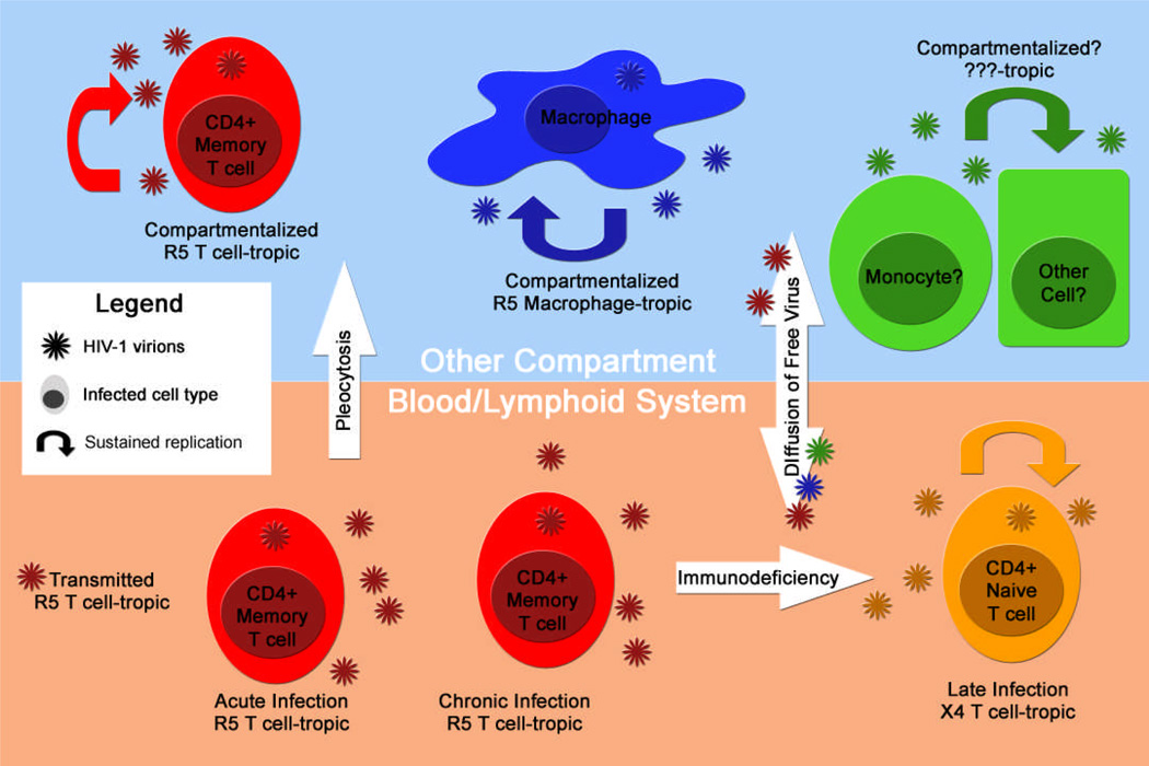 HIV-1 is completely dependent upon the Env protein to enter cells. The virus typically replicates in activated CD4+ T cells due to viral entry requirements for the CCR5 coreceptor and for high surface levels of the CD4 receptor. This is the case for the transmitted virus and for most of the virus sampled in the blood. Over the course of infection, the env gene can evolve to encode a protein with altered receptor and coreceptor usage allowing the virus to enter alternative host cells. In about 50% of HIV-1 infections, the viral population undergoes coreceptor switching, usually late in disease, allowing the virus to use CXCR4 to enter a different subset of CD4+ T cells. Neurocognitive disorders occur in about 10% of infections, also usually late in disease, but caused (ultimately) by viral replication in the brain either in CD4+ T cells or macrophage and/or microglia. Expanded host range is significantly intertwined with pathogenesis. Identification and characterization of such HIV-1 variants may be useful for early detection which would allow intervention to reduce viral pathogenesis in these alternative cell types.