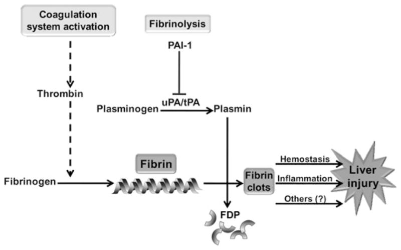 Plasminogen activator inhibitor-1 (PAI-1) is a major player in fibrinolysis due to its classical role of inhibiting plasminogen activators. Although increased fibrinolysis is common in alcoholic cirrhosis, decreased fibrinolysis (driven mostly by elevated levels of PAI-1) is common during the development of alcoholic liver disease (ALD). However, whether or not PAI-1 plays a causal role in the development of early ALD was unclear. Recent studies in experimental models have suggested that PAI-1 may contribute to the development of early (steatosis), intermediate (steatohepatitis) and late (fibrosis) stages of ALD. For example, fatty liver owing to both acute and chronic ethanol was blunted by the genetic inhibition of PAI-1. This effect of targeting PAI-1 appears to be mediated, at least in part, by an increase in very low-density lipoprotein (VLDL) synthesis in the genetic absence of this acute phase protein. Results from a two-hit model employing ethanol and lipopolysaccharide administration suggest that PAI-1 plays a critical role in hepatic inflammation, most likely due to its ability to cause fibrin accumulation, which subsequently sensitizes the liver to ensuing damaging insults. Lastly, the role of PAI-1 in hepatic fibrosis is less clear and appears that PAI-1 may serve a dual role in this pathological change, both protective (enhancing regeneration) and damaging (blocking matrix degradation). In summary, results from these studies suggest that PAI-1 may play multiple roles in the various stages of ALD, both protective and damaging. The latter effect is mediated by its influence on steatosis (i.e. decreasing VLDL synthesis), inflammation (i.e. impairing fibrinolysis) and fibrosis (i.e. blunting matrix degradation), whereas the former is mediated by maintaining hepatocyte division after an injury.