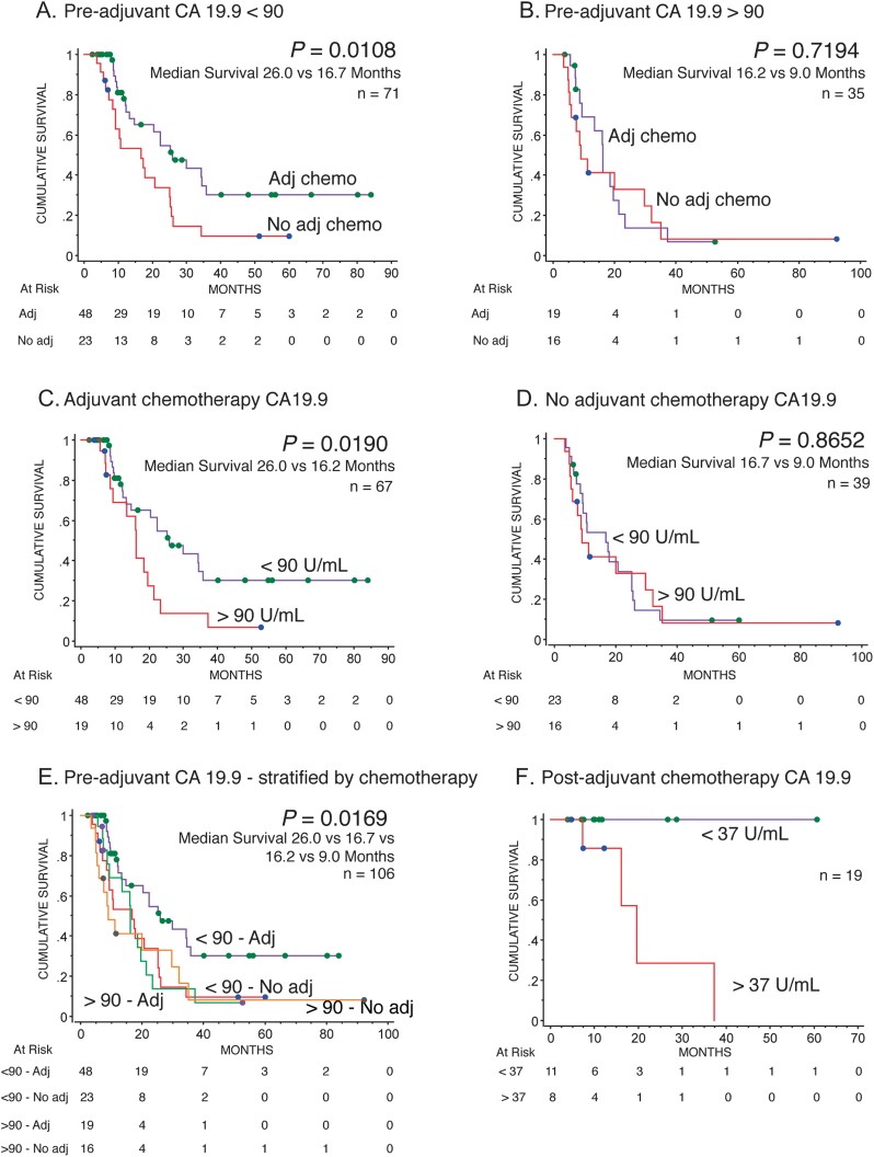 Results: By specifically assessing the subgroup of patients with detectable CA19.9, we identified potential utility at key clinical decision points. Low postoperative CA19.9 at 3 months (median survival 25.6 vs 14.8 months, P=0.0052) and before adjuvant chemotherapy were independent prognostic factors. Patients with postoperative CA 19.9 levels>90 U/ml did not benefit from adjuvant chemotherapy (P=0.7194) compared with those with a CA19.9 of ≤90 U/ml (median 26.0 vs 16.7 months, P=0.0108). Normalization of CA19.9 within 6 months of resection was also an independent favorable prognostic factor (median 29.9 vs 14.8 months, P=0.0004) and normal perioperative CA19.9 levels identified a good prognostic group, which was associated with a 5-year survival of 42%.