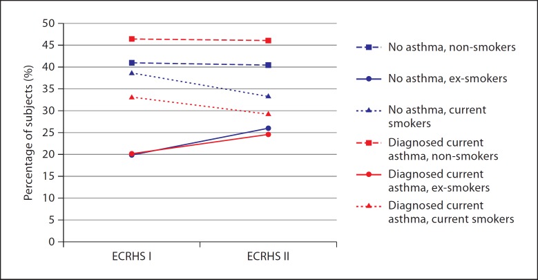 Results: At follow-up, smoking was significantly less frequent among subjects with asthma than in the rest of the population (26 vs. 31%; p < 0.001). Subjects with asthma who were already ex-smokers at the beginning of the follow-up in the 1990 s had the highest mean asthma score (number of reported asthma-like symptoms, range 0-5), probably as a result of the healthy smoker effect (2.80 vs. 2.44 in never smokers, 2.19 in quitters and 2.24 in smokers; p < 0.001). The influence of smoking on FEV(1) decline did not depend on asthma status. Smokers had the highest proportion of subjects with chronic cough/phlegm (p < 0.01).