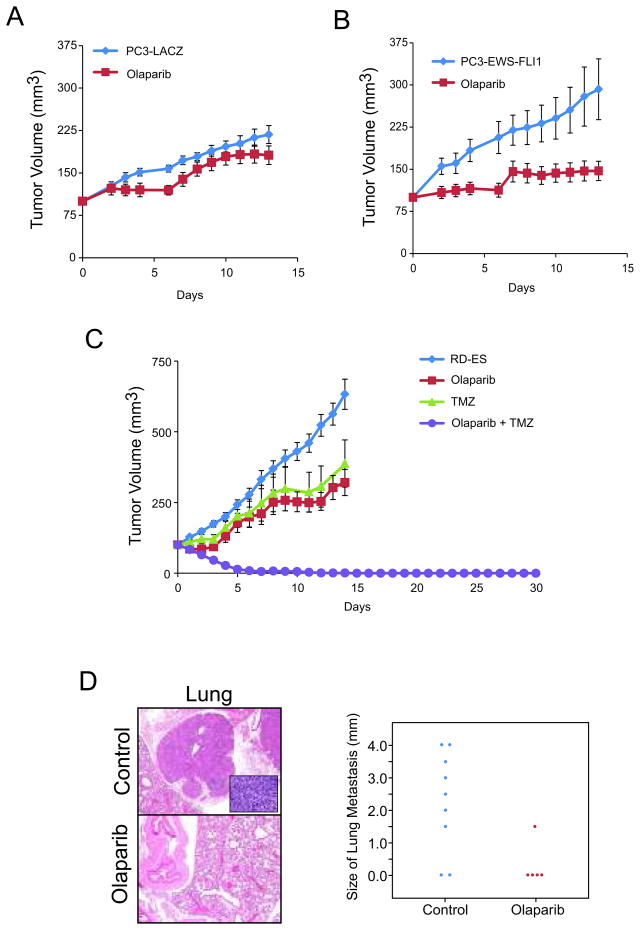 Ewing's sarcoma family of tumors (ESFT) refers to aggressive malignancies which frequently harbor characteristic EWS-FLI1 or EWS-ERG genomic fusions. Here, we report that these fusion products interact with the DNA damage response protein and transcriptional coregulator PARP-1. ESFT cells, primary tumor xenografts, and tumor metastases were all highly sensitive to PARP1 inhibition. Addition of a PARP1 inhibitor to the second-line chemotherapeutic agent temozolamide resulted in complete responses of all treated tumors in an EWS-FLI1-driven mouse xenograft model of ESFT. Mechanistic investigations revealed that DNA damage induced by expression of EWS-FLI1 or EWS-ERG fusion genes was potentiated by PARP1 inhibition in ESFT cell lines. Notably, EWS-FLI1 fusion genes acted in a positive feedback loop to maintain the expression of PARP1, which was required for EWS-FLI-mediated transcription, thereby enforcing oncogene-dependent sensitivity to PARP-1 inhibition. Together, our findings offer a strong preclinical rationale to target the EWS-FLI1:PARP1 intersection as a therapeutic strategy to improve the treatment of ESFTs.