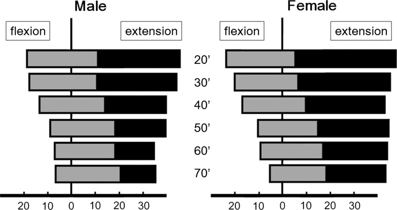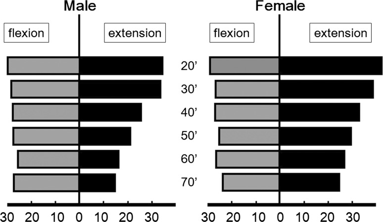 Conclusions: The standard values and age-related changes in cervical anatomy, alignment, and ROM for males and females in each decade between the 3rd and 8th were established. Cervical lordosis in the neutral position develops with aging, while extension ROM decreases gradually. These data will be useful as normal values for the sake of comparison in clinical practice.