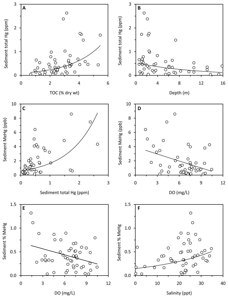 Total mercury (Hg) and methylmercury (MeHg) were analyzed in near surface sediments (0-2 cm) and biota (zooplankton, macro-invertebrates, finfish) collected from Narragansett Bay (Rhode Island/Massachusetts, USA) and adjacent embayments and tidal rivers. Spatial patterns in sediment contamination were governed by the high affinity of Hg for total organic carbon (TOC). Sediment MeHg and percent MeHg were also inversely related to summer bottom water dissolved oxygen (DO) concentrations, presumably due to the increased activity of methylating bacteria. For biota, Hg accumulation was influenced by inter-specific habitat preferences and trophic structure, and sediments with high TOC and percent silt-clay composition limited mercury bioavailability. Moreover, hypoxic bottom water limited Hg bioaccumulation, which is possibly mediated by a reduction in biotic foraging, and thus, dietary uptake of mercury. Finally, most biota demonstrated a significant positive relationship between tissue and TOC-normalized sediment Hg, but relationships were much weaker or absent for sediment MeHg. These results have important implications for the utility of estuarine biota as subjects for mercury monitoring programs.