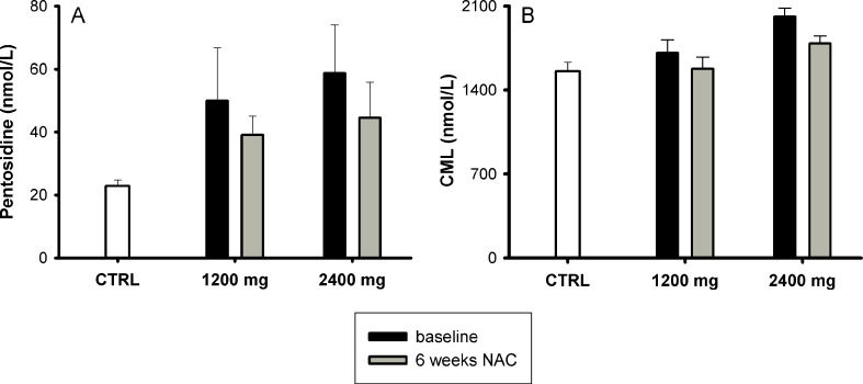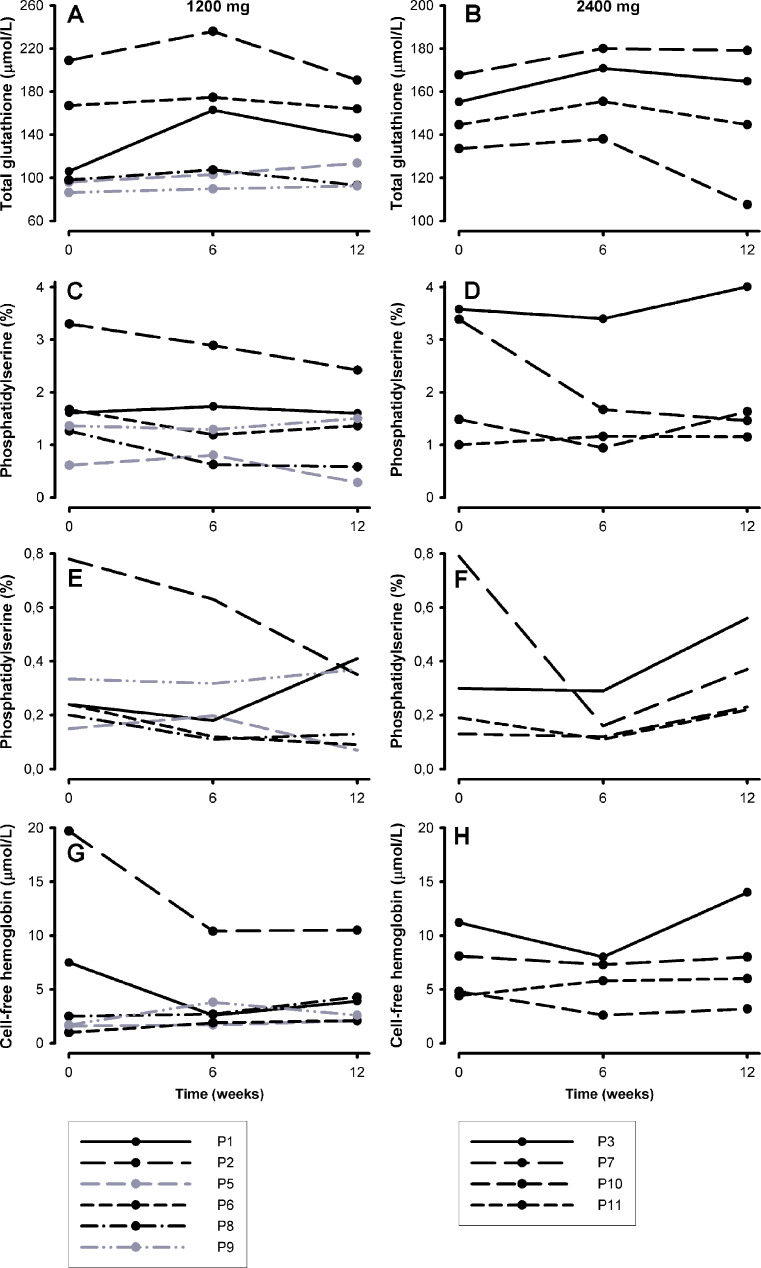 Oxidative stress is of importance in the pathophysiology of sickle cell disease (SCD). In this open label randomized pilot study the effects of oral N-acetylcysteine (NAC) on phosphatidylserine (PS) expression as marker of cellular oxidative damage (primary end point), and markers of hemolysis, coagulation and endothelial activation and NAC tolerability (secondary end points) were studied. Eleven consecutive patients (ten homozygous [HbSS] sickle cell patients, one HbSβ(0)-thalassemia patient) were randomly assigned to treatment with either 1,200 or 2,400 mg NAC daily during 6 weeks. The data indicate an increment in whole blood glutathione levels and a decrease in erythrocyte outer membrane phosphatidylserine exposure, plasma levels of advanced glycation end-products (AGEs) and cell-free hemoglobin after 6 weeks of NAC treatment in both dose groups. One patient did not tolerate the 2,400 mg dose and continued with the 1,200 mg dose. During the study period, none of the patients experienced painful crises or other significant SCD or NAC related complications. These data indicate that N-acetylcysteine treatment of sickle cell patients may reduce SCD related oxidative stress.