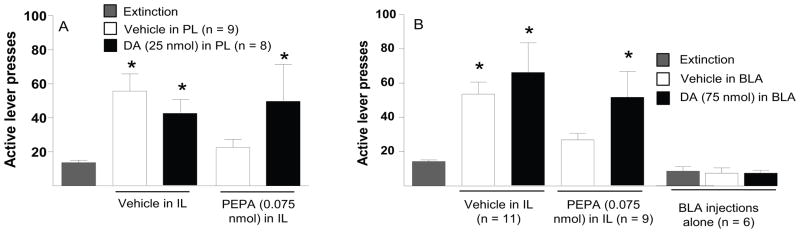 Following cocaine self-administration and extinction training, activity in the infralimbic cortex (IL) suppresses cocaine-seeking behavior. IL inactivation induces cocaine-seeking whereas activation suppresses cocaine-reinstated drug-seeking. We asked how the suppression of cocaine-seeking induced by IL activation integrates with the circuitry promoting reinstated cocaine-seeking. Following cocaine self-administration and extinction training, rats underwent cue-induced reinstatement. In order to activate IL projections, microinjections of PEPA, a positive allosteric modulator of AMPA receptors, were made into the IL in combination with microinjections into a variety of nuclei known to regulate cocaine-seeking. Intra-IL PEPA administration suppressed cue-induced reinstatement without affecting locomotor activity. The suppression of cocaine-seeking was reversed by activating dopamine neurons in the ventral tegmental area with microinjections of the μ-opioid receptor agonist DAMGO, and was partially reversed by dopamine microinjections into the prelimbic cortex or basolateral amygdala. Previous evidence suggests that the nucleus accumbens shell both promotes and suppresses cocaine-seeking. The suppression of cue-induced cocaine seeking by PEPA in the IL was reversed by intra-shell microinjections of either dopamine or the AMPA receptor antagonist CNQX, suggesting that the accumbens shell bidirectionally regulates cocaine-seeking depending on whether dopamine input is mimicked or glutamate input is inhibited. Together, these findings indicate that the IL acts 'upstream' from structures promoting cocaine-seeking, including from the mesolimbic dopamine projections to the prelimbic cortex and basolateral amygdala, and that the accumbens shell may be a crucial point of integration between the circuits that promote (ventral tegmental area) and inhibit (IL) reinstated cocaine-seeking.