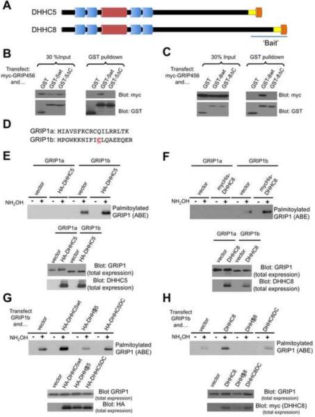 Palmitoylation, a key regulatory mechanism controlling protein targeting, is catalyzed by DHHC-family palmitoyl acyltransferases (PATs). Impaired PAT activity is linked to neurodevelopmental and neuropsychiatric disorders, suggesting critical roles for palmitoylation in neuronal function. However, few substrates for specific PATs are known, and functional consequences of palmitoylation events are frequently uncharacterized. Here, we identify the closely related PATs DHHC5 and DHHC8 as specific regulators of the PDZ domain protein GRIP1b. Binding, palmitoylation, and dendritic targeting of GRIP1b require a PDZ ligand unique to DHHC5/8. Palmitoylated GRIP1b is targeted to trafficking endosomes and may link endosomes to kinesin motors. Consistent with this trafficking role, GRIP1b's palmitoylation turnover rate approaches the highest of all reported proteins, and palmitoylation increases GRIP1b's ability to accelerate AMPA-R recycling. To our knowledge, these findings identify the first neuronal DHHC5/8 substrate, define novel mechanisms controlling palmitoylation specificity, and suggest further links between dysregulated palmitoylation and neuropathological conditions.