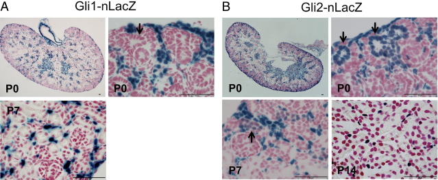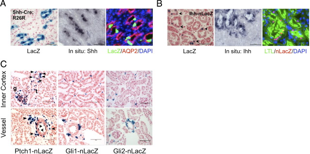 The Hedgehog (Hh) signaling pathway regulates tissue patterning during development, including patterning and growth of limbs and face, but whether Hh signaling plays a role in adult kidney remains undefined. In this study, using a panel of hedgehog-reporter mice, we show that the two Hh ligands (Indian hedgehog and sonic hedgehog ligands) are expressed in tubular epithelial cells. We report that the Hh effectors (Gli1 and Gli2) are expressed exclusively in adjacent platelet-derived growth factor receptor-β-positive interstitial pericytes and perivascular fibroblasts, suggesting a paracrine signaling loop. In two models of renal fibrosis, Indian Hh ligand was upregulated with a dramatic activation of downstream Gli effector expression. Hh-responsive Gli1-positive interstitial cells underwent 11-fold proliferative expansion during fibrosis, and both Gli1- and Gli2-positive cells differentiated into α-smooth muscle actin-positive myofibroblasts. In the pericyte-like cell line 10T1/2, hedgehog ligand triggered cell proliferation, suggesting a possible role for this pathway in the regulation of cell cycle progression of myofibroblast progenitors during the development of renal fibrosis. The hedgehog antagonist IPI-926 abolished Gli1 induction in vivo but did not decrease kidney fibrosis. However, the transcriptional induction of Gli2 was unaffected by IPI-926, suggesting the existence of smoothened-independent Gli activation in this model. This study is the first detailed description of paracrine hedgehog signaling in adult kidney, which indicates a possible role for hedgehog-Gli signaling in fibrotic chronic kidney disease.