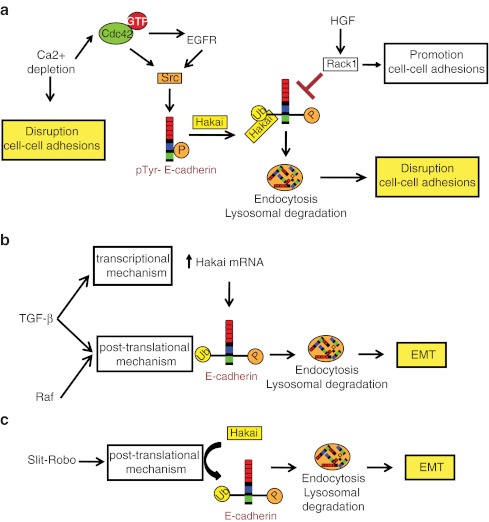 In order to metastasize, cancer cells must first detach from the primary tumor, migrate, invade through tissues, and attach to a second site. Hakai was discovered as an E3 ubiquitin-ligase that mediates the posttranslational downregulation of E-cadherin, a major component of adherens junctions in epithelial cells that is characterized as a potent tumor suppressor and is modulated during various processes including epithelial-mesenchymal transition. Recent data have provided evidences for novel biological functional role of Hakai during tumor progression and other diseases. Here, we will review the knowledge that has been accumulated since Hakai discovery 10 years ago and its implication in human cancer disease. We will highlight the different signaling pathways leading to the influence on Hakai and suggest its potential usefulness as therapeutic target for cancer.