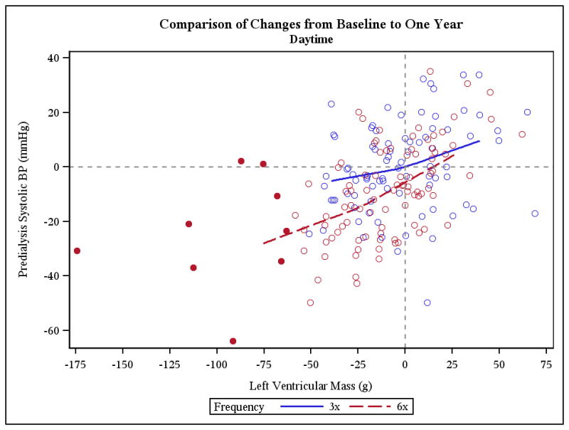 Conclusions: Frequent in-center hemodialysis reduces LVM. The benefit of frequent hemodialysis on LVM may be mediated by salutary effects on blood pressure. Clinical Trial Registration- URL: http://www.clinicaltrials.gov. Unique identifier: NCT00264758.