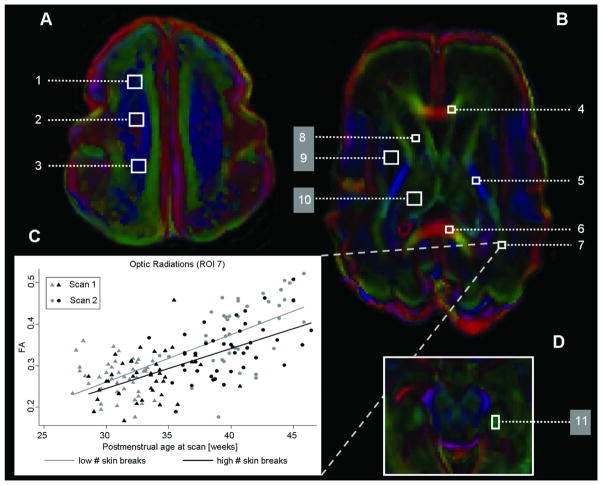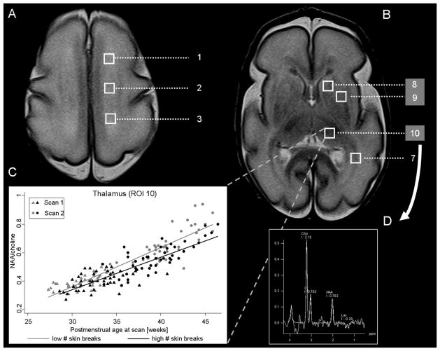 Methods: Infants born very preterm (N=86; 24-32 weeks gestational age) were followed prospectively from birth, and studied with magnetic resonance imaging, 3-dimensional magnetic resonance spectroscopic imaging, and diffusion tensor imaging: scan 1 early in life (median, 32.1 weeks) and scan 2 at term-equivalent age (median, 40 weeks). We calculated N-acetylaspartate to choline ratios (NAA/choline), lactate to choline ratios, average diffusivity, and white matter fractional anisotropy (FA) from up to 7 white and 4 subcortical gray matter regions of interest. Procedural pain was quantified as the number of skin-breaking events from birth to term or scan 2. Data were analyzed using generalized estimating equation modeling adjusting for clinical confounders such as illness severity, morphine exposure, brain injury, and surgery.
