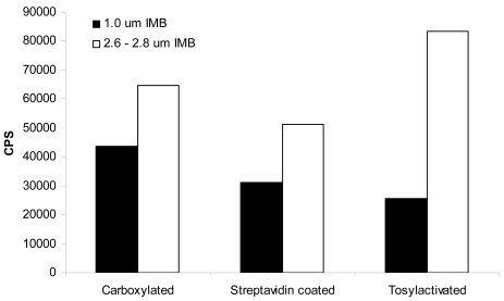 Immunomagnetic beads (IMB) were synthesized using anti-Escherichia coli O157 antibodies and magnetic beads of two different sizes (1 μm and 2.6 to 2.8 μm) that contained a streptavidin coating, activated carboxyl groups or tosylated surfaces. The synthesized IMB, together with a commercially available IMB, were used to capture different strains of E. coli O157:H7 and E. coli O157:NM. The E. coli capture was measured by the time resolved fluorescence (TRF) intensity using a sandwich assay which we have previously demonstrated of having a sensitivity of 1 CFU/g after 4.5 hour enrichment [1]. The analyses of measured TRF intensity and determined antibody surface concentration indicated that larger beads provided higher response signals than smaller beads and were more effective in capturing the target of interest in pure culture and ground beef. In addition, while each type of IMB showed different favorable capture of E. coli O157:H7, streptavidin-coated IMB elicited the highest response, on average. Streptavidin-coated IMB also provided an economic benefit, costing less than $0.50 per assay. The results could be used to guide the proper choice of IMB for applications in developing detection processes for E. coli O157:H7.