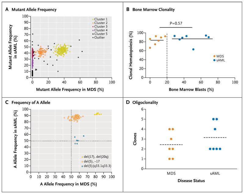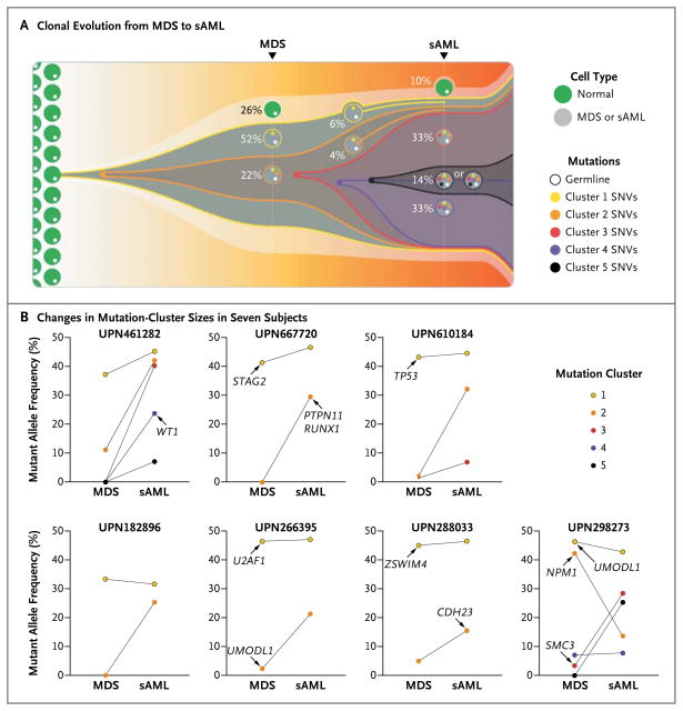 Conclusions: Nearly all the bone marrow cells in patients with myelodysplastic syndromes and secondary AML are clonally derived. Genetic evolution of secondary AML is a dynamic process shaped by multiple cycles of mutation acquisition and clonal selection. Recurrent gene mutations are found in both founding clones and daughter subclones. (Funded by the National Institutes of Health and others.).