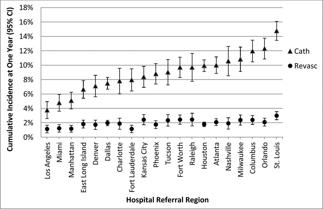 Results: Within 60 days, only 8.8% of stress test patients underwent cardiac catheterization and only 2.7% underwent revascularization; within 1 year, only 0.5% died and had myocardial infarction or stroke. There were marked geographic variations in 1-year rates of catheterization (3.8%-14.8%) and revascularization (1.2%-3.0%) across 20 hospital referral regions.