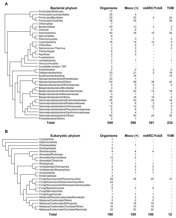 The trace element molybdenum (Mo) is the catalytic component of important enzymes involved in global nitrogen, sulfur, and carbon metabolism in both prokaryotes and eukaryotes. With the exception of nitrogenase, Mo is complexed by a pterin compound thus forming the biologically active molybdenum cofactor (Moco) at the catalytic sites of molybdoenzymes. The physiological roles and biochemical functions of many molybdoenzymes have been characterized. However, our understanding of the occurrence and evolution of Mo utilization is limited. This article focuses on recent advances in comparative genomics of Mo utilization in the three domains of life. We begin with a brief introduction of Mo transport systems, the Moco biosynthesis pathway, the role of posttranslational modifications, and enzymes that utilize Mo. Then, we proceed to recent computational and comparative genomics studies of Mo utilization, including a discussion on novel Moco-binding proteins that contain the C-terminal domain of the Moco sulfurase and that are suggested to represent a new family of molybdoenzymes. As most molybdoenzymes need additional cofactors for their catalytic activity, we also discuss interactions between Mo metabolism and other trace elements and finish with an analysis of factors that may influence evolution of Mo utilization.
