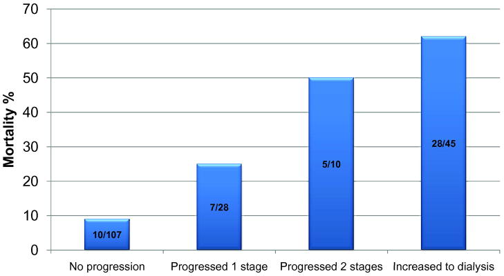 Conclusion: AKI, as defined by AKIN criteria, in patients with cirrhosis is frequently progressive and severe and is independently associated with mortality in a stage-dependent fashion. Methods for earlier diagnosis of AKI and its progression may result in improved outcomes by facilitating targeted and timely treatment of AKI.