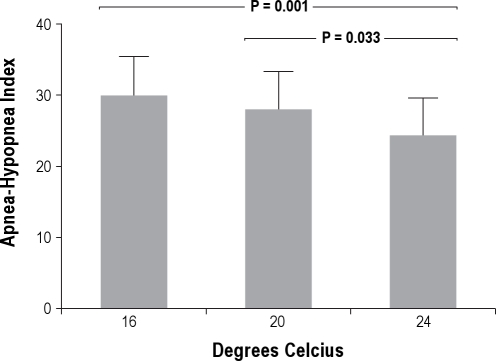 Results: The obstructive apnea-hypopnea index was 30 ± 17 at 16°C room temperature, 28 ± 17 at 20°C, and 24 ± 18 at 24°C. The obstructive apnea-hypopnea index was higher at 16°C room temperature versus 24°C (P = 0.001) and at 20°C room temperature versus 24°C (P = 0.033). Total sleep time was a mean of 30 min longer (P = 0.009), mean sleep efficiency was higher (77 ± 11% versus 71 ± 13% respectively, P = 0.012), and the patients were significantly more alert according to the Karolinska Sleepiness Scale (P < 0.028) in the morning at 16°C room temperature versus 24°C. The amount of sleep in different sleep stages was not affected by room temperature.