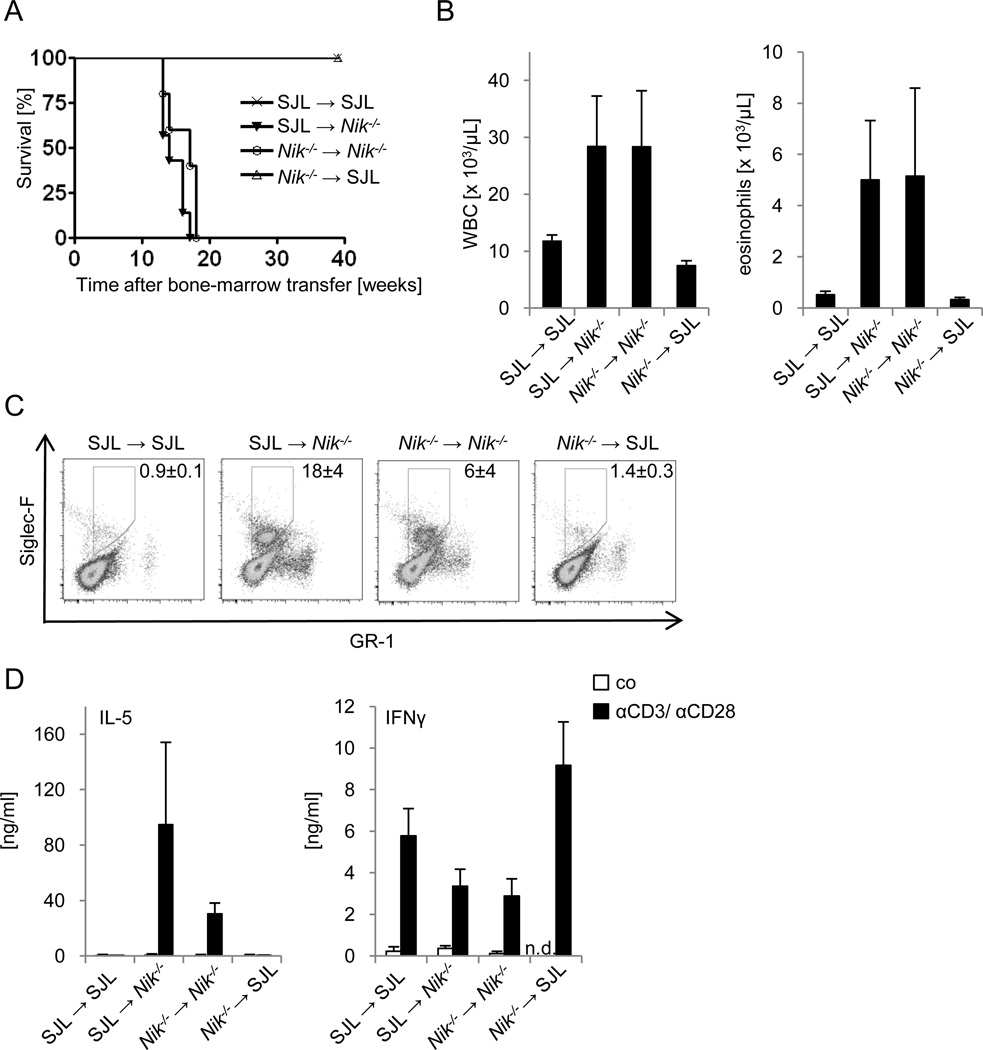 Immune cell-mediated tissue injury is a common feature of different inflammatory diseases, yet the pathogenetic mechanisms and cell types involved vary significantly. Hypereosinophilic syndrome (HES) represents a group of inflammatory diseases that is characterized by increased numbers of pathogenic eosinophilic granulocytes in the peripheral blood and diverse organs. On the basis of clinical and laboratory findings, various forms of HES have been defined, yet the molecular mechanism and potential signaling pathways that drive eosinophil expansion remain largely unknown. In this study, we show that mice deficient of the serine/threonine-specific protein kinase NF-κB-inducing kinase (NIK) develop a HES-like disease, reflected by progressive blood and tissue eosinophilia, tissue injury, and premature death at around 25-30 wk of age. Similar to the lymphocytic form of HES, CD4(+) T cells from NIK-deficient mice express increased levels of Th2-associated cytokines, and eosinophilia and survival of NIK-deficient mice could be prevented completely by genetic ablation of CD4(+) T cells. Experiments based on bone marrow chimeric mice, however, demonstrated that inflammation in NIK-deficient mice depended on radiation-resistant tissues, implicating that NIK-deficient immune cells mediate inflammation in a nonautonomous manner. Surprisingly, disease development was independent of NIK's known function as an IκB kinase α (IKKα) kinase, because mice carrying a mutation in the activation loop of IKKα, which is phosphorylated by NIK, did not develop inflammatory disease. Our data show that NIK activity in nonhematopoietic cells controls Th2 cell development and prevents eosinophil-driven inflammatory disease, most likely using a signaling pathway that operates independent of the known NIK substrate IKKα.
