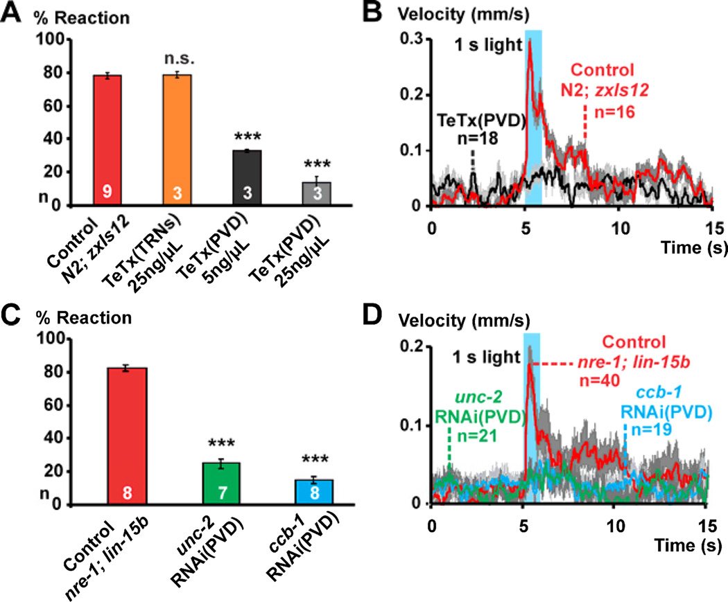 Results: Selectively photoactivating PVD, FLP, and downstream interneurons via Channelrhodopsin-2 (ChR2) enabled the functional dissection of this nociceptive network, without interfering signals by other mechanoreceptors. Forward or reverse escape behaviors were determined by PVD and FLP, via integration by command interneurons. To identify mediators of PVD function, acting downstream of primary nocisensor molecules, we knocked down PVD-specific transcripts by RNAi and quantified light-evoked PVD-dependent behavior. Cell-specific disruption of synaptobrevin or voltage-gated Ca(2+) channels (VGCCs) showed that PVD signals chemically to command interneurons. Knocking down the DEG/ENaC channel ASIC-1 and the TRPM channel GTL-1 indicated that ASIC-1 may extend PVD's dynamic range and that GTL-1 may amplify its signals. These channels act cell autonomously in PVD, downstream of primary mechanosensory molecules.