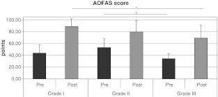 Results: The AOFAS score increased significantly from 47.3 (±15.3) to 80.8 (±18.6) points. Lesions with intact cartilage (grades I and II) had a tendency to superior results than grade III lesions (83.1 ± 17.3 vs. 69.4 ± 22.2 points, p = 0.07). First-line treatments and open distal tibial growth plates led to significantly better outcomes (each p < 0.05). Age, gender, BMI, time to follow-up, defect localisation or a traumatic origin did not influence the score results. On a visual analogue scale pain intensity reduced from 7.5 (±1.5) to 3.7 (±2.6) while subjective function increased from 4.6 (±2.0) to 8.2 (±2.3) (each p < 0.001). In MRI follow-ups, five of the 41 patients showed a complete bone remodelling. In two cases demarcation was detectable.