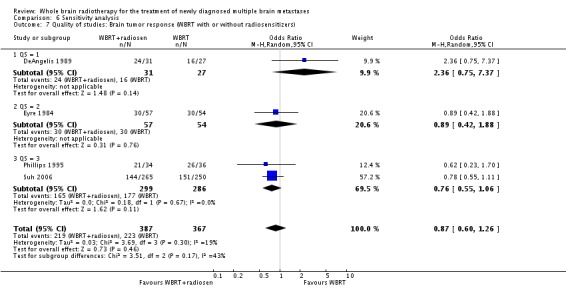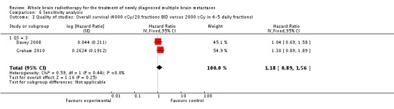 Main results: Nine RCTs involving 1420 participants were added in this updated review. This updated review now includes a total of 39 trials involving 10,835 participants.Eight published reports (nine RCTs) showed no benefit of altered dose-fractionation schedules as compared to the control fractionation (3000 cGy in 10 fractions daily) of WBRT for overall survival. These studies also showed no improvement in symptom control nor neurologic improvement among the different dose-fractionation schemes as compared to 3000 cGy in 10 daily fractions of WBRT. This updated review includes two trials comparing 4000 cGy in 20 fractions given twice daily versus 2000 cGy in 4 or 5 daily fractions. Overall, there was no survival advantage (hazard ratio (HR) 1.18, 95% confidence interval (CI) 0.89 to 1.56, P = 0.25) with the use of 4000 cGy in 20 fractions given twice daily compared to 2000 cGy in 4 or 5 daily fractions.The addition of radiosensitizers in six RCTs did not confer additional benefit to WBRT in either the overall survival times (HR 1.08, 95% CI 0.98 to 1.18, P = 0.11) or brain tumour response rates (HR 0.87, 95% CI 0.60 to 1.26, P = 0.46).Two RCTs found no benefit in overall survival (HR 0.61, 95% CI 0.27 to 1.39, P = 0.24) with the use of WBRT and radiosurgery boost as compared to WBRT alone for selected participants with multiple brain metastases (up to four brain metastases). Overall, there was a statistically significant improvement in local brain control (HR 0.35, 95% CI 0.20 to 0.61, P = 0.0003) favouring the WBRT and radiosurgery boost arm. Only one trial of radiosurgery boost with WBRT reported an improved Karnofsky performance score outcome and improved ability to reduce the dexamethasone dose.In this updated review, a total of three RCTs reported on selected patients (with up to three or four brain metastases) treated with radiosurgery alone versus WBRT and radiosurgery. Based on two trials, there was no difference in overall survival (HR 0.98, 95% CI 0.71 to 1.35, P = 0.88). The addition of WBRT when added to radiosurgery significantly improved locally treated brain metasatases control (HR 2.61, 95% CI 1.68 to 4.06, P < 0.0001) and distant brain control (HR 2.15, 95% CI 1.55 to 2.99, P < 0.00001). On the other hand, one trial concluded that patients treated with WBRT and radiosurgery boost were significantly more likely to show a decline in learning and memory function as compared to those treated with radiosurgery alone.One RCT examined the use of WBRT and prednisone versus prednisone alone and produced inconclusive results.