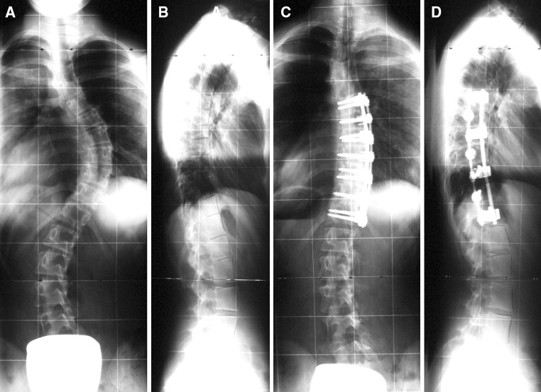 Results: Fusion was carried out mostly from end-to-end vertebra. The primary curve was corrected from 61.6° (average correction on reverse bending films 42.9 %) to 27.1° (56.0 % correction) with an average loss of correction of 2.2°. The secondary lumbar curve measured 47.7° preoperatively (40-56°, average correction on reverse bending films 66.2 %) and corrected spontaneously to 30.1° (36 % SLCC) and remained stable without any cases of deterioration or decompensation during follow-up. Lumbar apical vertebral translation increased minimally by an average of 4 mm directly, postoperatively, and returned to an average of preoperative values during follow-up. All but two curves remained as type C lumbar modifier at follow-up. Preoperatively, three patients showed a marked coronal imbalance of more than 3 cm (all left, average 4.0 cm); at follow-up, two patients were still out of balance by more than 3 cm (all to the left, average 3.4 cm). Preoperatively, a marked shoulder imbalance of more than 1.0 cm was found in 11 patients; this was corrected in all patients to <1.0 cm at follow-up. The apical vertebral rotation measured according to Perdriolle was corrected from 23.5° to 15.0° in the thoracic spine (36.2 % correction) with an average clinical reduction of the rib hump of 63.2 %. In the lumbar spine, there was no relevant radiological derotation; however, clinically, the lumbar hump corrected spontaneously by 44.3 %. Thoracic kyphosis measured 28.5° preoperatively and 32.3° at follow-up. All six patients with a preoperative hypokyphosis (<20°) of an average of 9.5° were successfully corrected to an average thoracic kyphosis of 23.8° at follow-up. There were no cases of junctional thoracolumbar kyphosis. There were neither reoperations nor implant failures with pseudarthrosis.
