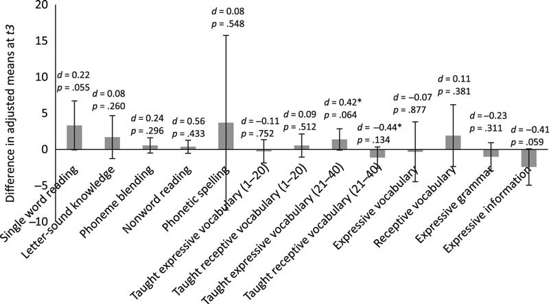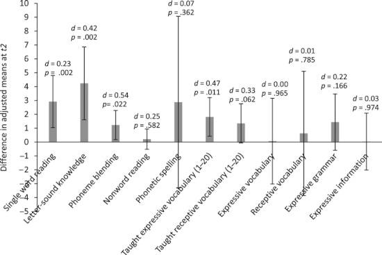Results: After 20 weeks of intervention, the intervention group showed significantly greater progress than the waiting control group on measures of single word reading, letter-sound knowledge, phoneme blending and taught expressive vocabulary. Effects did not transfer to other skills (nonword reading, spelling, standardised expressive and receptive vocabulary, expressive information and grammar). After 40 weeks of intervention, the intervention group remained numerically ahead of the control group on most key outcome measures; but these differences were not significant. Children who were younger, attended more intervention sessions, and had better initial receptive language skills made greater progress during the course of the intervention.