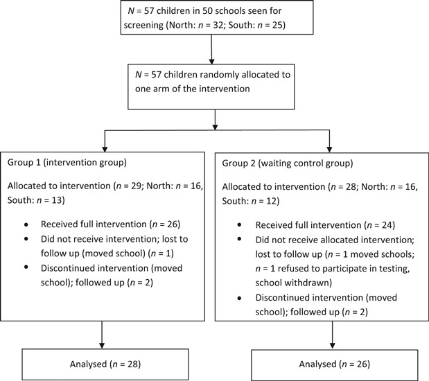 Methods: Teaching assistants (TAs) were trained to deliver a reading and language intervention to children in individual daily 40-min sessions. We used a waiting list control design, in which half the sample received the intervention immediately, whereas the remaining children received the treatment after a 20-week delay. Fifty-seven children with Down syndrome in mainstream primary schools in two U.K. locations (Yorkshire and Hampshire) were randomly allocated to intervention (40 weeks of intervention) and waiting control (20 weeks of intervention) groups. Assessments were conducted at three time points: pre-intervention, after 20 weeks of intervention, and after 40 weeks of intervention.