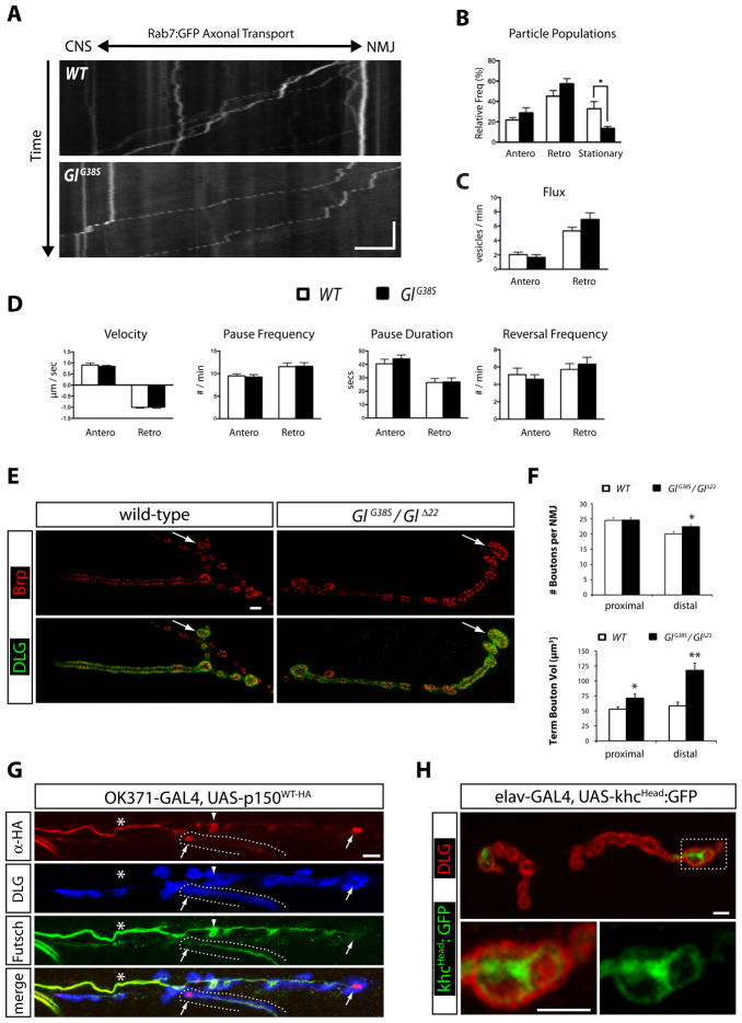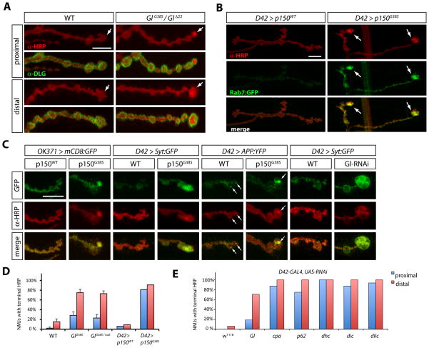 p150(Glued) is the major subunit of dynactin, a complex that functions with dynein in minus-end-directed microtubule transport. Mutations within the p150(Glued) CAP-Gly microtubule-binding domain cause neurodegenerative diseases through an unclear mechanism. A p150(Glued) motor neuron degenerative disease-associated mutation introduced into the Drosophila Glued locus generates a partial loss-of-function allele (Gl(G38S)) with impaired neurotransmitter release and adult-onset locomotor dysfunction. Disruption of the p150(Glued) CAP-Gly domain in neurons causes a specific disruption of vesicle trafficking at terminal boutons (TBs), the distal-most ends of synapses. Gl(G38S) larvae accumulate endosomes along with dynein and kinesin motor proteins within swollen TBs, and genetic analyses show that kinesin and p150(Glued) function cooperatively at TBs to coordinate transport. Therefore, the p150(Glued) CAP-Gly domain regulates dynein-mediated retrograde transport at synaptic termini, and this function of dynactin is disrupted by a mutation that causes motor neuron disease.