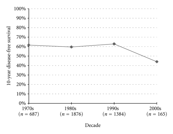 Four decades ago, specialized chemotherapy regimens turned osteosarcoma, once considered a uniformly fatal disease, into a disease in which a majority of patients survive. Though significant survival gains were made from the 1960s to the 1980s, further outcome improvements appear to have plateaued. This study aims to comprehensively review all significant, published data regarding osteosarcoma and outcome in the modern medical era in order to gauge treatment progress. Our results indicate that published survival improved dramatically from 1960s to 1980s and then leveled, or in some measures decreased. Recurrence rates decreased in the 1970s and then leveled. In contrast, published limb salvage rates have increased significantly every recent decade until the present. Though significant gains have been made in the past, no improvement in published osteosarcoma survival has been seen since 1980, highlighting the importance of a new strategy in the systemic management of this still very lethal condition.
