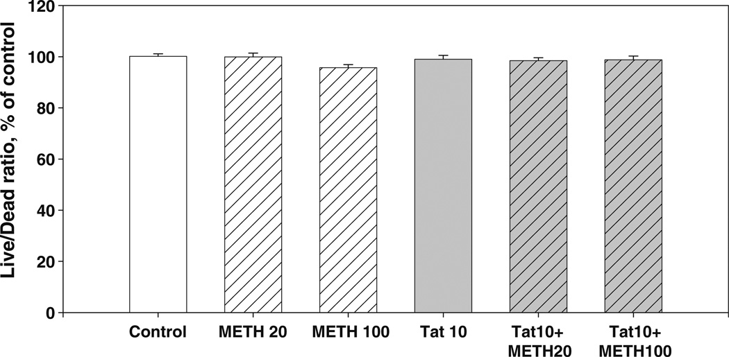 The interactive effects of HIV-1 infection and methamphetamine (METH) abuse in producing cognitive dysfunction represent a serious medical problem; however, the neural mechanisms underlying this interactive neurotoxicity remain elusive. In this study, we report that a combination of low, sub-toxic doses of METH + HIV-1 Tat 1-86 B, but not METH + HIV-1 gp120, directly induces death of rodent midbrain neurons in vitro. The effects of D1- and NMDA-receptor specific antagonists (SCH23390 and MK-801, respectively) on the neurotoxicity of different doses of METH or HIV-1 Tat alone and on the METH + HIV-1Tat interaction in midbrain neuronal cultures suggest that the induction of the cell death cascade by METH and Tat requires both dopaminergic (D1) and N-methyl D-aspartate (NMDA) receptor-mediated signaling. This interactive METH+Tat neurotoxicity does not occur in cultures of hippocampal neurons, which are predominately glutamatergic, express very low levels of dopamine receptors, and have no functional dopamine transporter (DAT). Thus, the presence of a subpopulation of neurons capable of dopamine release/uptake is essential for METH+Tat induction of the cell death cascade. Overall, our results support the hypothesis that METH and HIV-1 Tat disrupt the normal conjunction of signaling between D1 and NMDA receptors, resulting in neural dysfunction and death.
