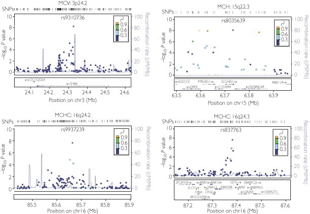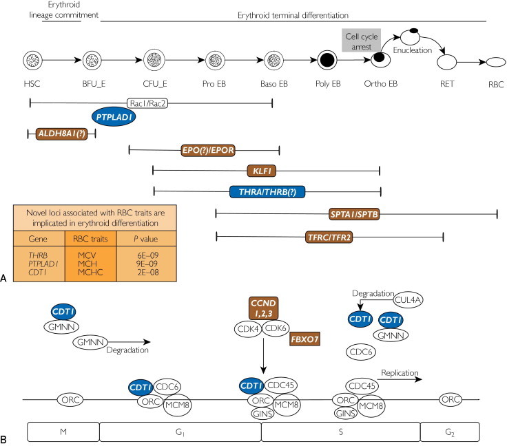 Results: We identified 4 new genetic loci and replicated 11 loci previously reported to be associated with one or more RBC traits in individuals of European ancestry. Notably, genes present in 3 of the 4 newly identified loci (THRB, PTPLAD1, CDT1) and in 6 of the 11 replicated loci (KLF1, ALDH8A1, CCND3, SPTA1, FBXO7, TFR2/EPO) are implicated in erythroid differentiation and regulation of cell cycle in hematopoietic stem cells.