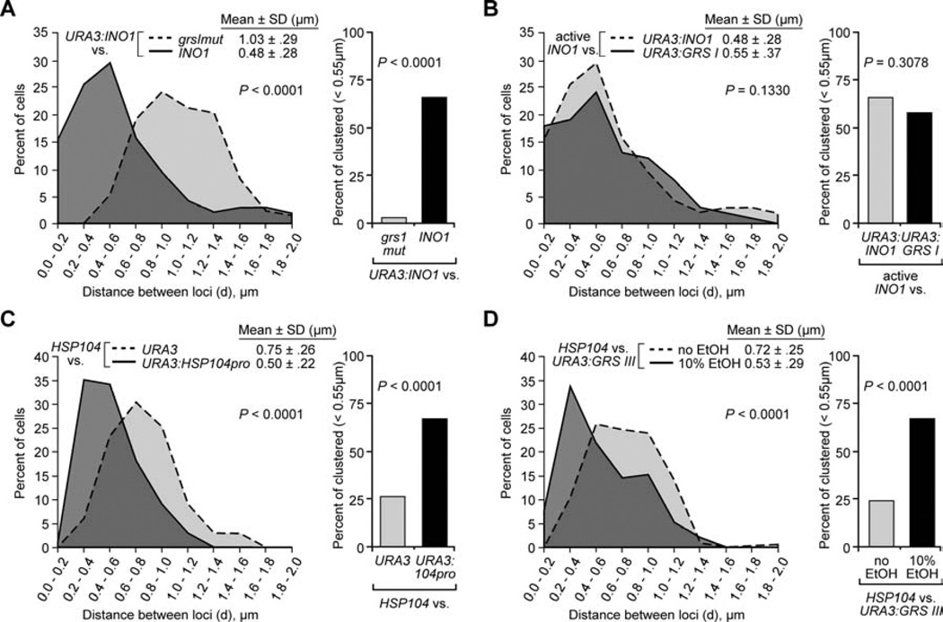 Active genes in yeast can be targeted to the nuclear periphery through interaction of cis-acting "DNA zip codes" with the nuclear pore complex. We find that genes with identical zip codes cluster together. This clustering was specific; pairs of genes that were targeted to the nuclear periphery by different zip codes did not cluster together. Insertion of two different zip codes (GRS I or GRS III) at an ectopic site induced clustering with endogenous genes that have that zip code. Targeting to the nuclear periphery and interaction with the nuclear pore is a prerequisite for gene clustering, but clustering can be maintained in the nucleoplasm. Finally, we find that the Put3 transcription factor recognizes the GRS I zip code to mediate both targeting to the NPC and interchromosomal clustering. These results suggest that zip-code-mediated clustering of genes at the nuclear periphery influences the three-dimensional arrangement of the yeast genome.