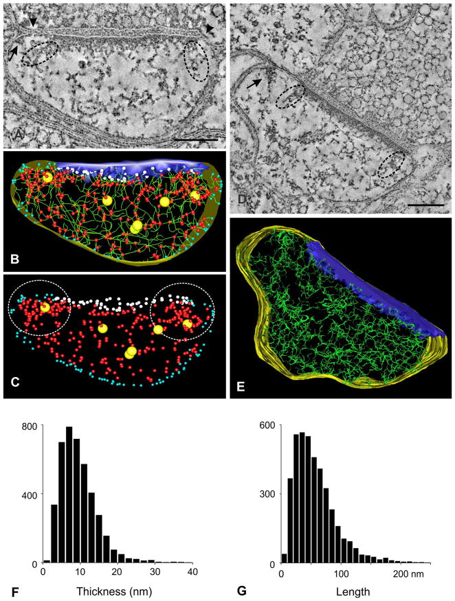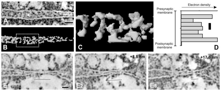Synaptic function depends on interactions among sets of proteins that assemble into complex supramolecular machines. Molecular biology, electrophysiology, and live-cell imaging studies have provided tantalizing glimpses into the inner workings of the synapse, but fundamental questions remain regarding the functional organization of these "nano-machines." Electron tomography reveals the internal structure of synapses in three dimensions with exceptional spatial resolution. Here we report results from an electron tomographic study of axospinous synapses in neocortex and hippocampus of the adult rat, based on aldehyde-fixed material stabilized with tannic acid in lieu of postfixation with osmium tetroxide. Our results provide a new window into the structural basis of excitatory synaptic processing in the mammalian brain.