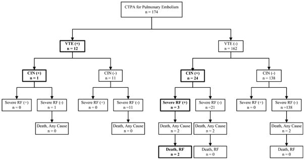 Results: A total of 174 patients underwent CTPA, which demonstrated acute PE in 12 (7%, 95% confidence interval [CI] = 3% to 12%). Twenty-five patients developed CIN (14%, 95% CI = 10% to 20%) including one with acute PE. The development of CIN after CTPA significantly increased the risk of the composite outcome of severe renal failure or death from renal failure within 45 days (relative risk = 36, 95% CI = 3 to 384). No severe adverse outcomes were directly attributable to complications of venous thromboembolism (VTE) or its treatment.