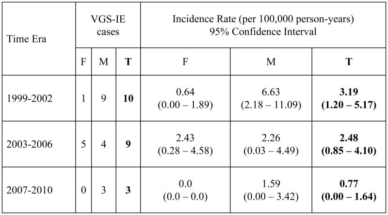 Methods and results: We performed a population-based review of all definite or possible cases of VGS-IE using the Rochester Epidemiology Project of Olmsted County, Minnesota. Patient demographics and microbiological data were collected for all VGS-IE cases diagnosed from January 1, 1999, through December 31, 2010. We also examined the Nationwide Inpatient Sample hospital discharge database to determine the number of VGS-IE cases included between 1999 and 2009. We identified 22 cases with VGS-IE in Olmsted County over the 12-year study period. Rates of incidence (per 100 000 person-years) during time intervals of 1999-2002, 2003-2006, and 2007-2010 were 3.19 (95% confidence interval, 1.20-5.17), 2.48 (95% confidence interval, 0.85-4.10), and 0.77 (95% confidence interval, 0.00-1.64), respectively (P=0.061 from Poisson regression). The number of hospital discharges with a VGS-IE diagnosis in the Nationwide Inpatient Sample database during 1999-2002, 2003-2006, and 2007-2009 ranged between 15 318 to 15 938, 16 214 to 17 433, and 14 728 to 15 479, respectively.